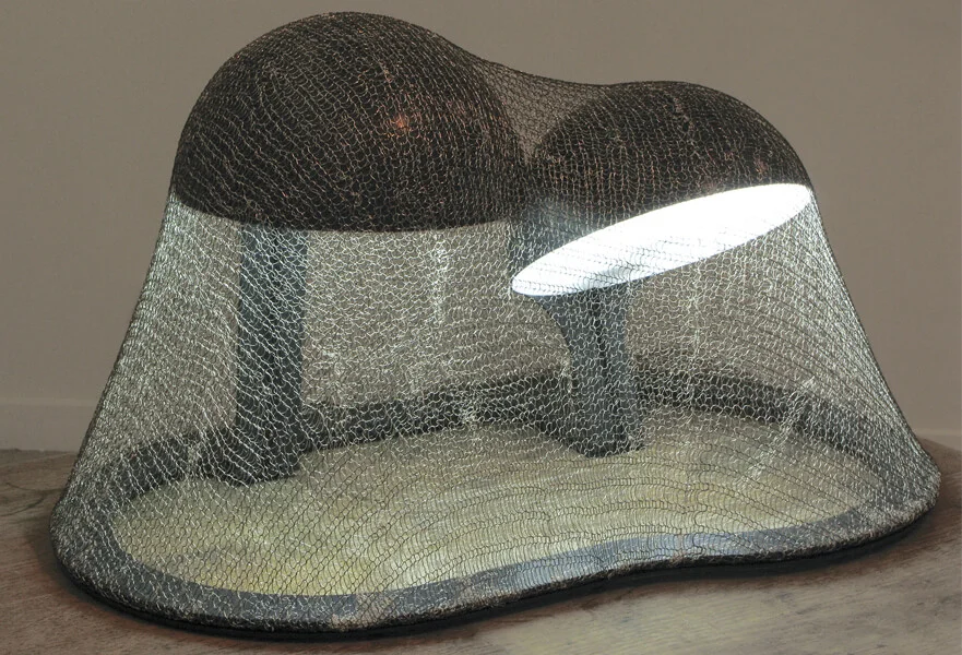 “The knitted fabrics created by Diana Brennan reveal their copper, stainless steel or silver threads when illuminated. We wanted to imagine lamps from this iridescent cloth, by dressing the light source. We wanted to work in different ways to showcase the richness and poetic qualities of this new material.”